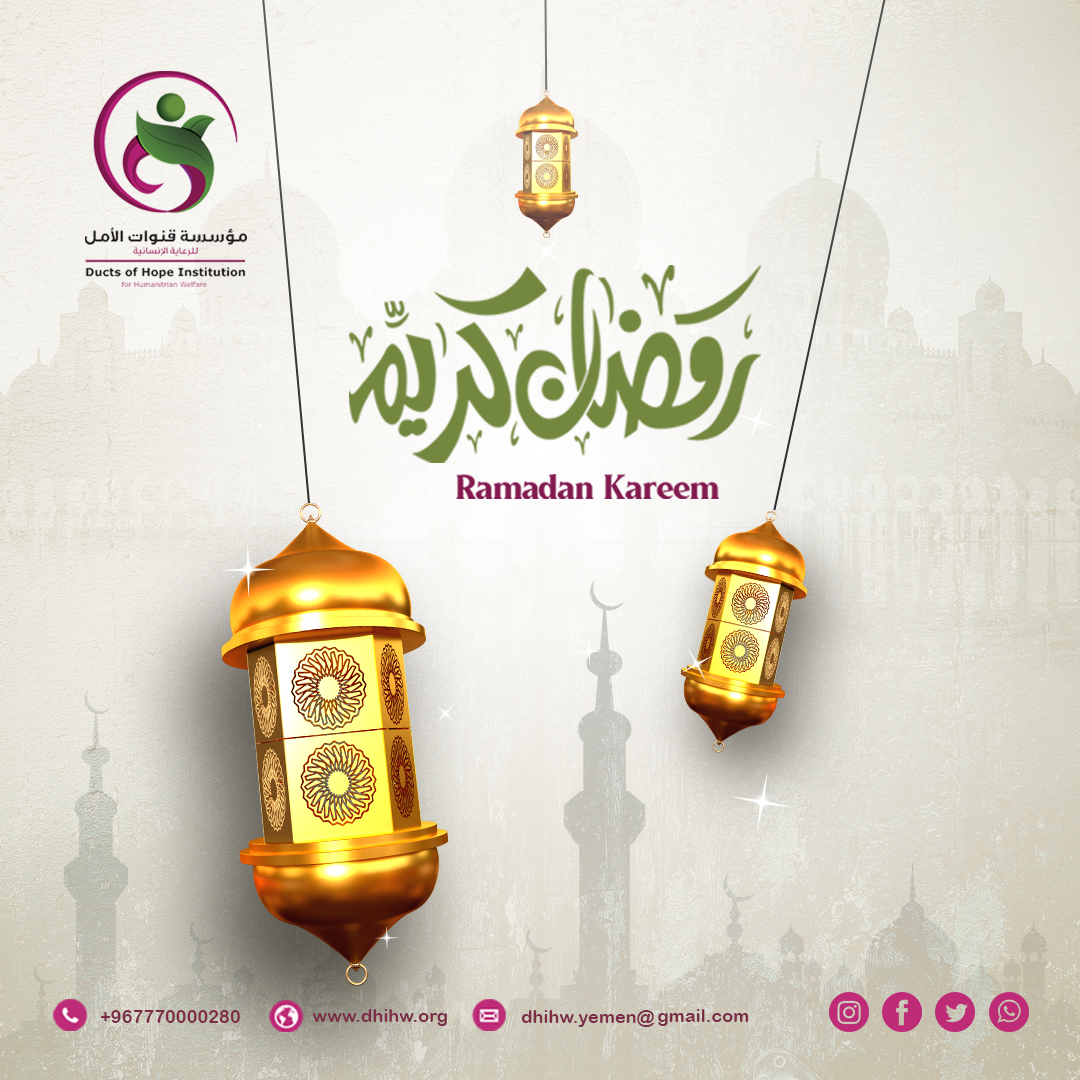 تهنئكم مؤسسة قنوات الأمل للرعاية الإنسانية بحلول #شهر_رمضان المبارك، سائلين المولى عز وجل أن يتقبل منا ومنكم صالح الأعمال، وأن يعيده علينا وعليكم بالخير واليمن والبركات.