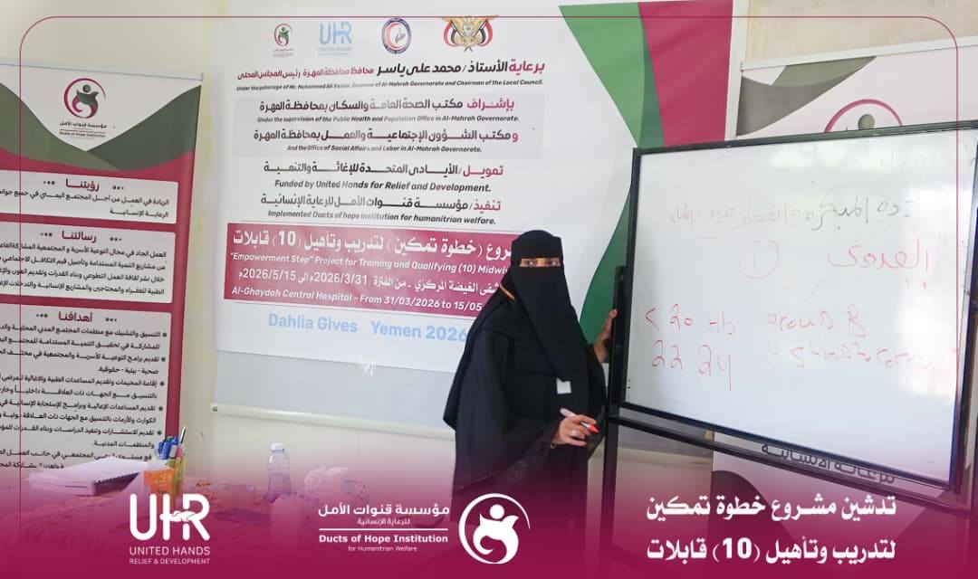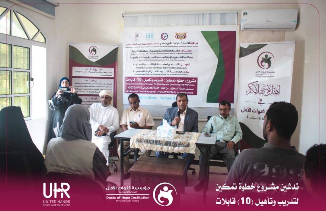 دشّنت مؤسسة قنوات الأمل للرعاية الإنسانية صباح اليوم الأحد الموافق 2026/04/05م مشروع “خطوة تمكين” لتدريب وتأهيل (10) قابلات وذلك في مقر المؤسسة بحضور رسمي ومشاركة عدد من القيادات الصحية والتنموية بالمحافظة.
