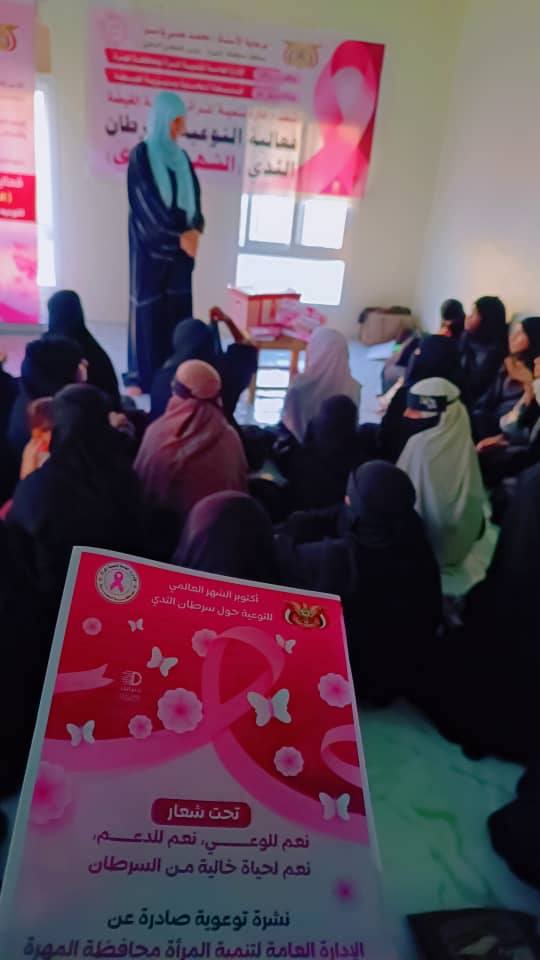 نفذت إدارة تنمية المرأة بمديرية الغيضة اليوم الثلاثاء فعالية توعوية بمناسبة الشهر العالمي للتوعية بسرطان الثدي "أكتوبر الوردي"، تحت إشراف الإدارة العامة لتنمية المرأة وبرعاية محافظ محافظة المهرة الأستاذ محمد علي ياسر.